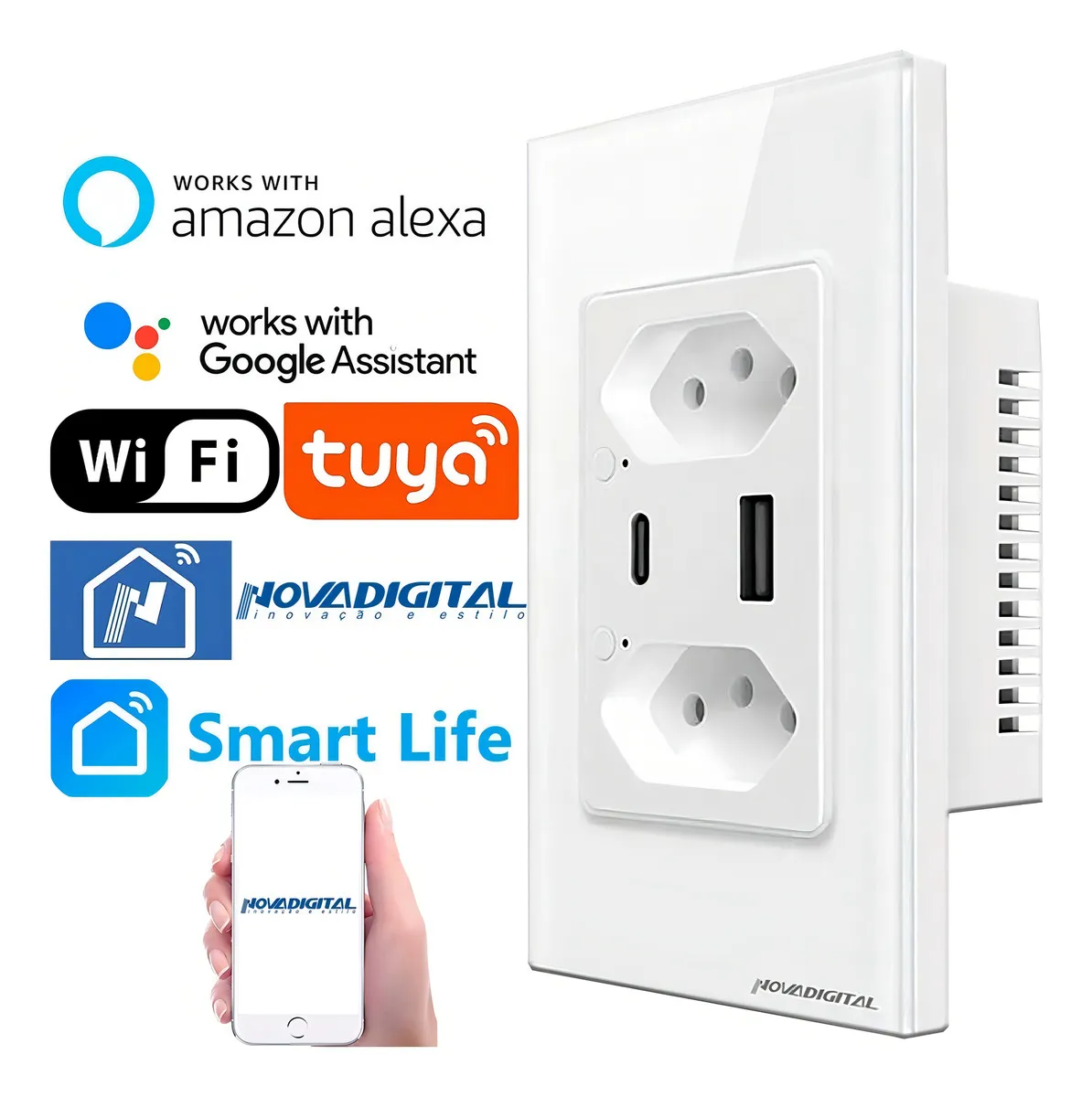 O produto deve ser ligado em NEUTRO + fase (127V ou 220V) ou 2 fases (127V + 127V - 220V TOTAIS) para funcionar. A tensão de ligação de ambas tomadas será igual: 110V ou 220V. O produto necessita de fio neutro e conecta-se somente em redes Wi-Fi 2.4Ghz (não conecta em redes 5G). A porta USB-C deste modelo NÃO suporta celulares com carregamento tipo "TURBO" (modelos mais recentes da Apple, Samsung e similares). Neste caso, recomendamos tirar a opção "TURBO" para a porta USB-C ou carregar na tomada convencional. Especificações Técnicas: - Tensão de entrada/saída: 110V - 250V AC Bivolt. - Potência máxima das tomadas: 1840W/110V e 3680W/220V. - Com 1 Tomada 10A e outra 20A (pino grosso) controladas separadamente via app. - Ligação NEUTRO + fase (127V ou 220V) ou 2 fases (127V + 127V = 220V). - Tensão/Corrente máxima entrada USB-C: 5V / 2.4A. - Padrão Wi-Fi: 2.4GHz IEEE 802.11 b / g / n. (não compatível com 5G). - Comando de voz: compatível com Alexa da Amazon e Google Assistant: controle sem as mãos com sua voz. - App do Produto: NovaDigital, Tuya ou Smart Life: controle o produto a distância. - Tomadas padrão brasileiro 3 pinos. - Aterramento padrão e fio neutro necessário. - Luz LED indicador de funcionamento. - É possível controlar as tomadas individualmente via app. - Controle por voz: controle funções do produto sem as mãos através de assistentes virtuais. - Compartilhamento: compartilhe funções do produto com amigos e familiares via app. - Temporizador: crie horários para ligar/desligar aparelhos conectados. - Cenas inteligentes: crie cenas inteligentes via app para uma automação de rotinas. - Configuração via app como a tomada deve retornar em caso de queda de energia. - Ao cair a luz é possível configurar para o aparelho retornar desligado, ligado ou lembrar do últimos status (retransmissão de status / "relay status") - Vidro temperado frontal anti risco e de fácil limpeza. - Materiais: termoplástico, vidro temperado metais e circuito eletrônico. - Consumo em standy-by: 0.5W. - Padrão brasileiro caixa 4x2 de embutir (sem 'quebra-quebra'). - Medidas: 120 x 72 x 45mm (12 x 7.2 x 4.5cm). - Peso aproximado: 150g. - Certificado pela Anatel: 08206-21-11765. - Materiais: plástico ABS e circuitos eletrônicos. - Cor: branco. - Modelo: tomada inteligente dupla USB S2C-USB-C. - Marca: NovaDigital. Conteúdo da embalagem: - 1 Tomada dupla + USB + USB-C NovaDigital. - 2x Parafuso de fixação. - 1 Manual de instruções, uso e configuração em português. Descrição Detalhada: A tomada inteligente Wi-Fi NovaDigital S2C-USB-C tornará o seu dia a dia muito mais fácil e versátil através de uma automação residencial inteligente. Controle funções do produto sem as mãos através de comando de voz compatível com Alexa da Amazon, Google Home/Assistant. Configure e use o produto de maneira inteligente através do app própria NovaDigital. Compatível também com Tuya e Smart Life. Tomadas Bivolt 110V-250VAC, entrada USB padrão e USB-C com indicador de funcionamento luz LED, 3 pinos padrão brasileiro e certificada pela Anatel (08206-21-11765). Recomendações do fabricante: Requisitos Mínimos de Rede Wi-Fi: Rede Wi-Fi com alto desempenho, escalável, com alta capacidade interna para administração de dispositivos e com boa distribuição do sinal no local. Ideal, tipo Mesh, com capacidade para 100 ou mais dispositivos.
